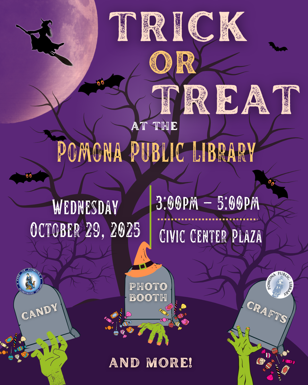 🕸️ The Pomona Public Library is brewing up Halloween fun for all ages! Come dressed in costume and enjoy crafts, candy, photo booth and community cheer — a treat for the whole family!