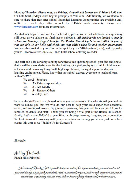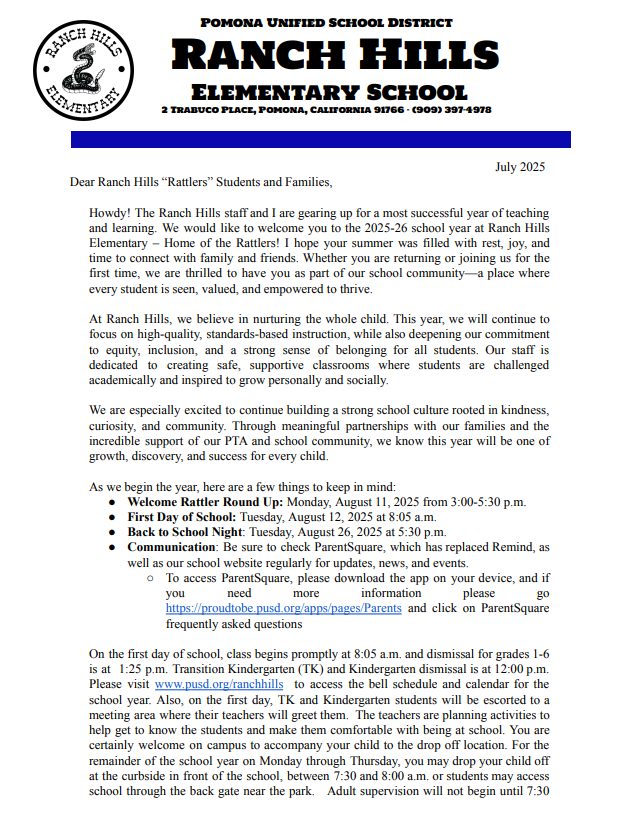 Ranch Hills Welcome Letter 2025-26